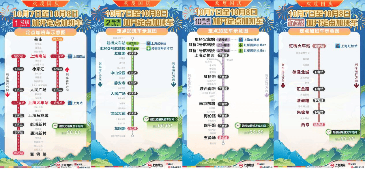 10月7日至10月8日,地铁1、2、10、17号线将加开定点加班车,末班车发车时间延长至次日0点。此外,地铁运营方根据现场客流需求,或将进一步延长定点加班车开行时间。