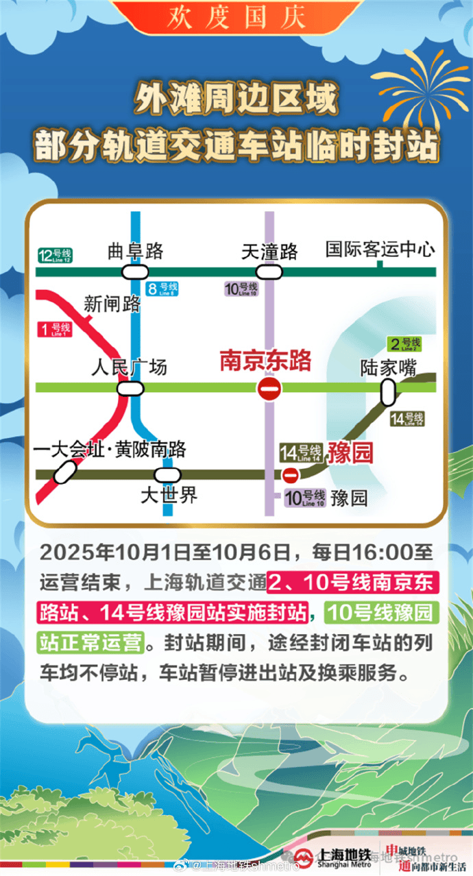 上海地铁公告:10月1日至6日,每日16时至运营结束,地铁2、10号线号线豫园站计划实施封站。需要提醒的是,临时封站时间或将根据相关部门要求有所调整。
