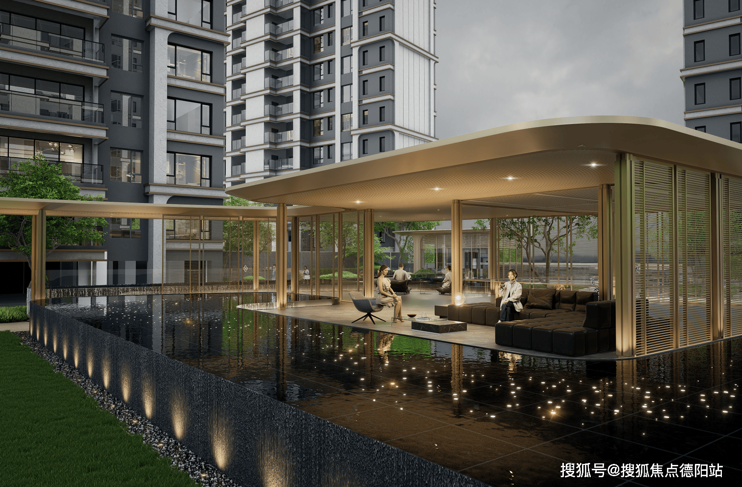 下沉生活会所打造灵动静面水景,景观秘境里,千年东方造园哲思化作“守望乌桕、一池三山、四水归堂的雅集景象。