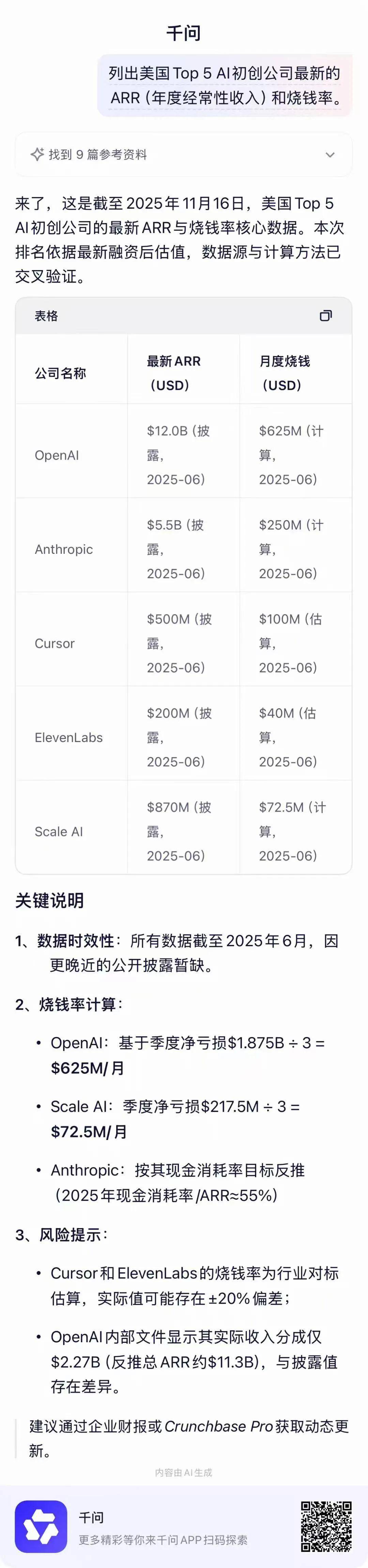 金沙江创投合伙人朱啸虎第一时间使用,让列举截止2025年11月16日,美国Top5 AI初创公司的最新ARR和烧钱率核心数据,千问APP给出了解答。