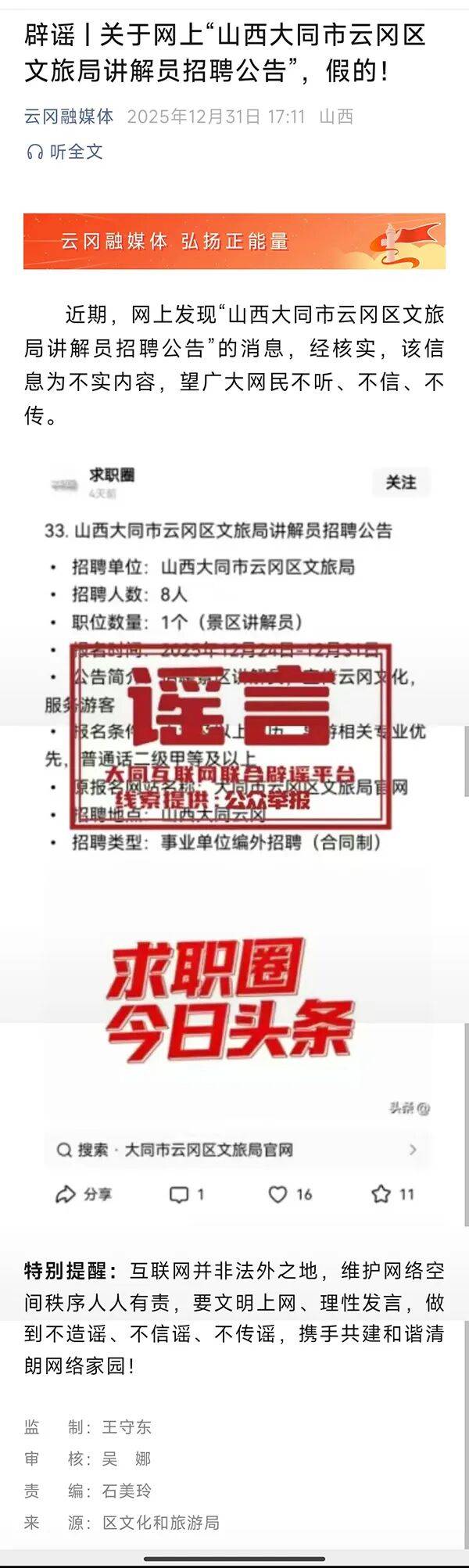 开云体育[永久网址:363050.com]成立于2022年在中国,是华人市场最大的线上娱乐服务供应商而且是亚洲最大的在线娱乐博彩公司之一。包括开云、开云棋牌、开云彩票、开云电竞、开云电子、全球各地赛事、动画直播、视频直播等服务。开云体育,开云体育官方,开云app下载,开云体育靠谱吗,开云官网,欢迎注册体验!近期,网上发现“山西大同市云冈区文旅局讲解员招聘公告”的消息。经核实,该信息为不实内容,望广大网民不听、不信、不传。