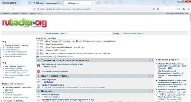 然后点击添加到firefox,此时该组件就添加到了firefox中了。添加完成后就会自动跳转到RuTracker的网站了,如图: