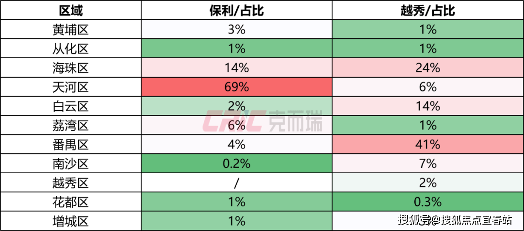 TOP30 “金字塔式”分化,除了双雄领跑,第二梯队的竞争同样精彩,TOP10房企里面有7家房企排名同比上升,保利置业、中国中铁、知识城集团排名上升亮眼。其中,保利置业排名大幅上升16位跃居权益榜第三,销售金额同比增加3.09亿元,增长最为显著,近六成业绩来自荔湾白鹅潭广州·保利翡丽甲第;广州地铁地产依托TOD开发优势以5.02亿元位列第四;其它房企销售金额集中在3亿—4亿元,业绩差距较小。