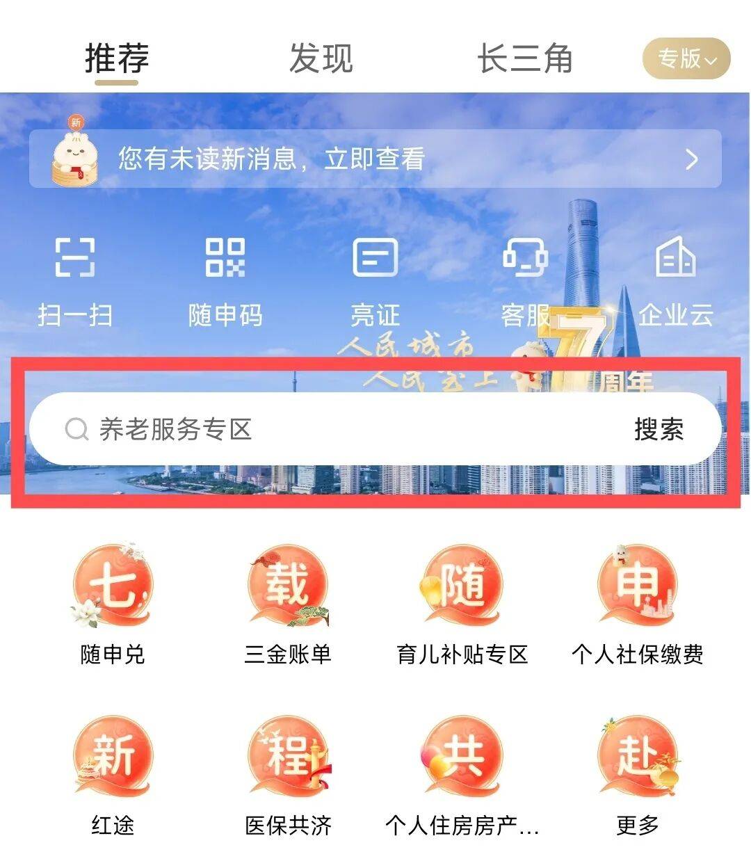 随申办市民云APP首页搜索框搜索关键词“三金账单”,进入对应服务,即可一键查询养老金、公积金和医保金账户明细。